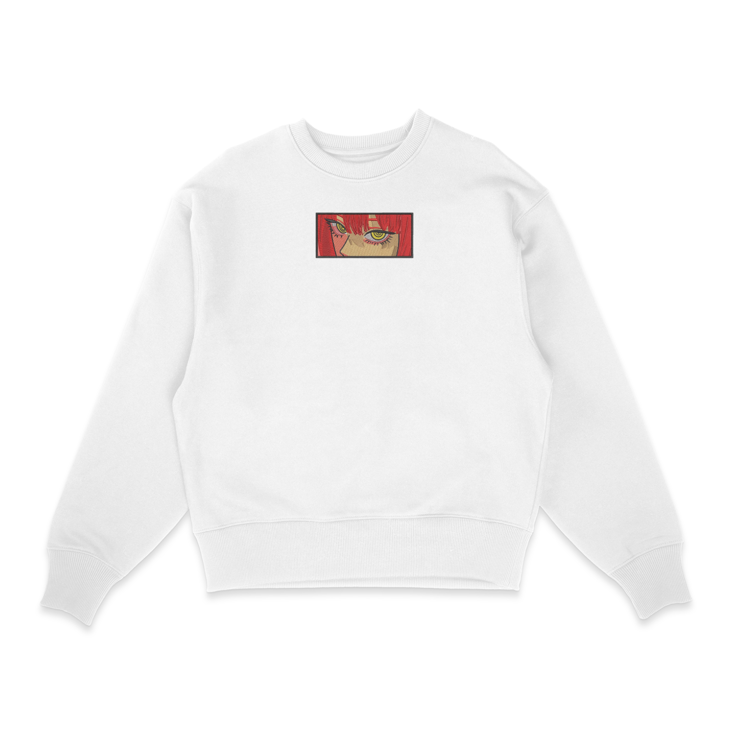 Ce sweat brodé met en avant Makima dans un portrait captivant, reflétant son aura intrigante et son charisme. La broderie capture parfaitement l’univers intense et sombre de Chainsaw Man.